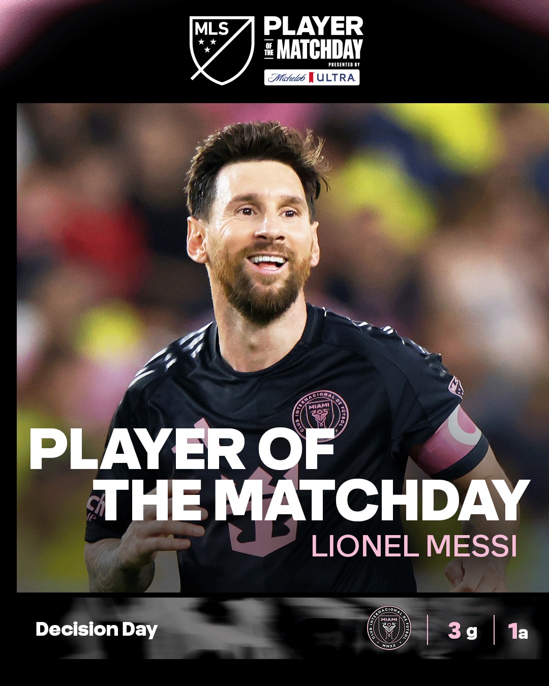 据美职联官方消息,3球1助的梅西当选了美职联最后一个比赛日的最佳球员,据统计,这是他连续第六次荣获美职联比赛日最佳球员。